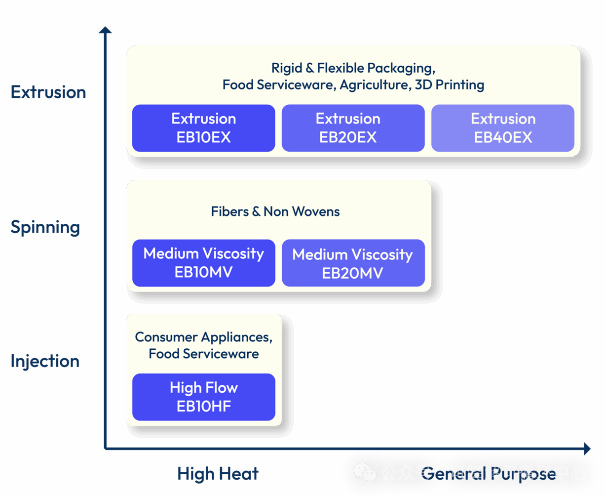 Embio产品组合涵盖多种聚乳酸(PLA)等级,适用于硬质与软质包装、涂层纸板、纤维、无纺布及3D打印领域。