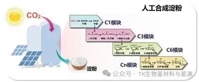 2021年,中国科学院天津工业生物技术研究所联合大连化学物理研究所,在国际上首次实现不依赖植物光合作用的二氧化碳到淀粉的人工全合成。该途径通过化学催化与酶促反应相结合,将二氧化碳逐步合成为淀粉。与光伏和电解水产氢装置联用,该系统可以利用阳光、水和二氧化碳合成淀粉,其合成速率和理论能量转化效率均超过玉米等农作物。随后,该单位团队还于2023年实现了从二氧化碳到葡萄糖、甘露糖等多种糖类化合物的精准合成。
