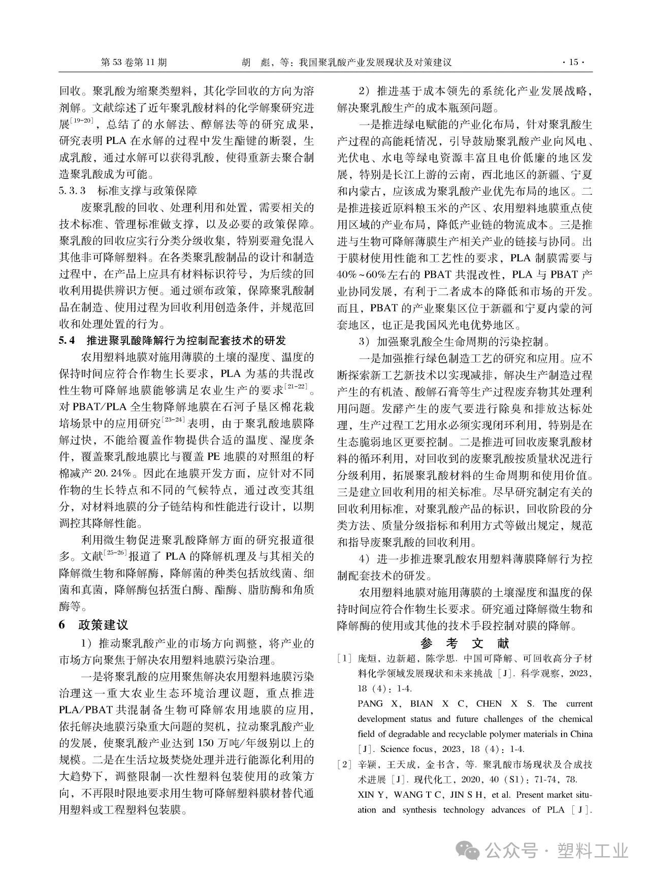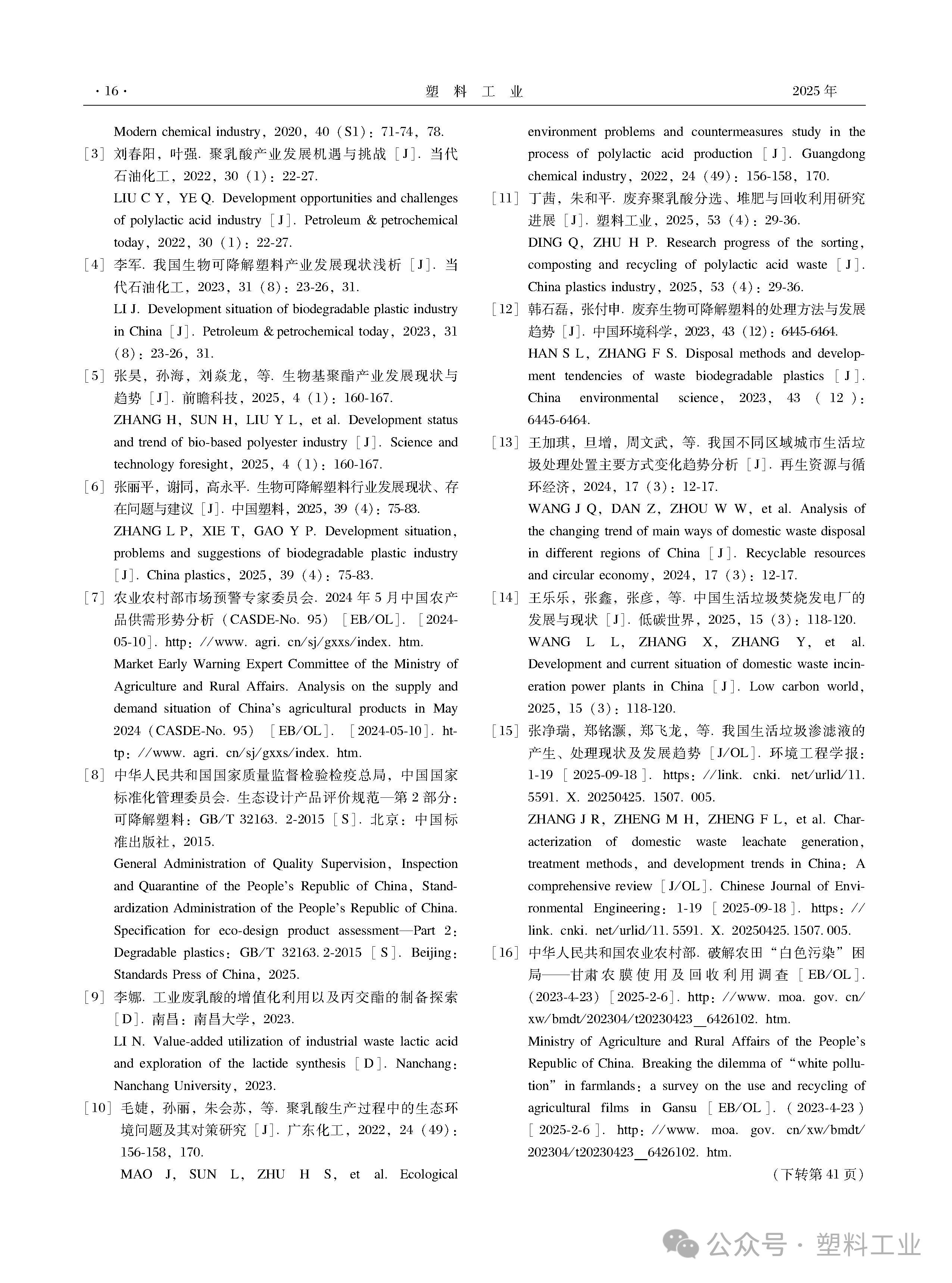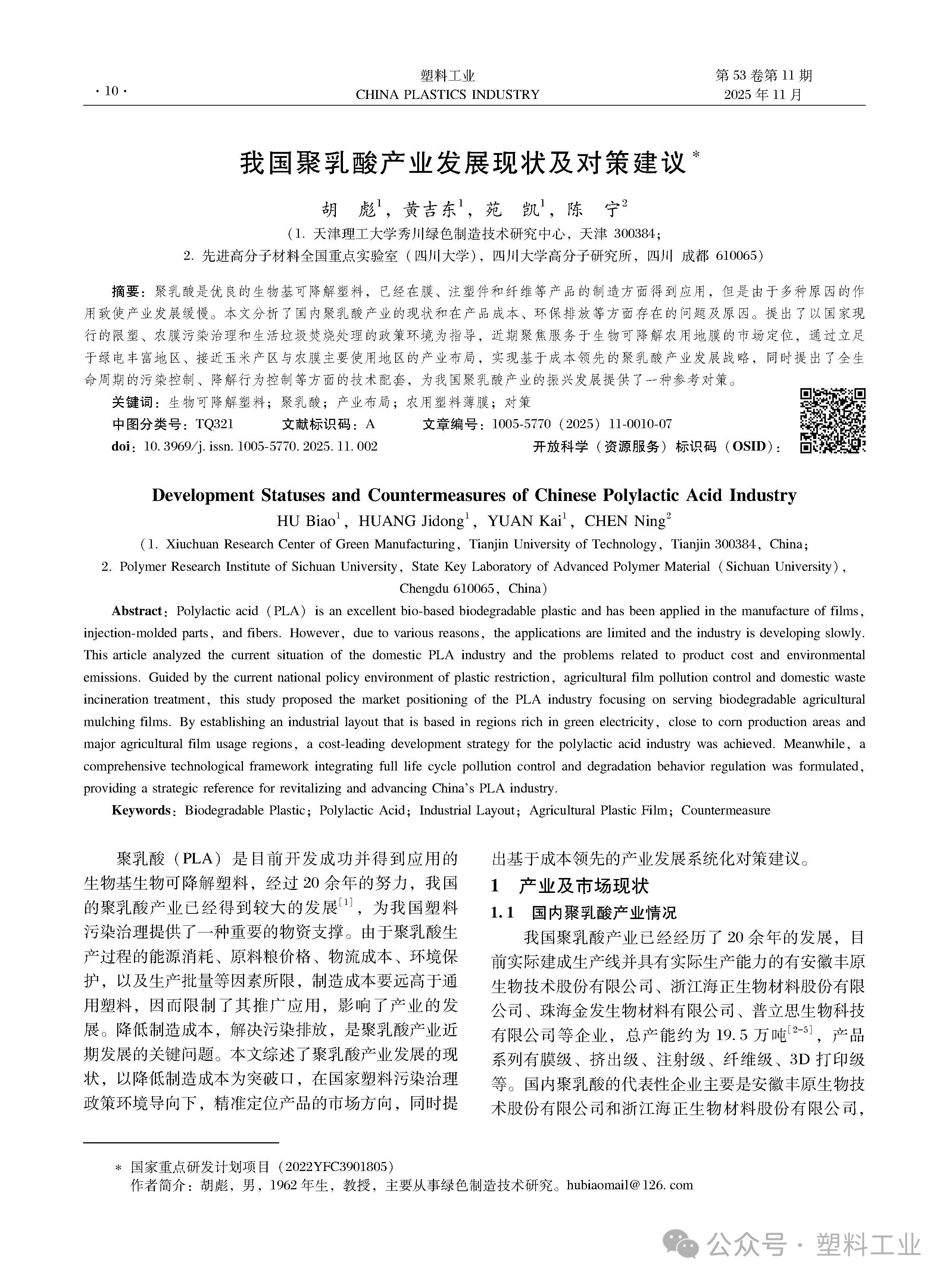 胡彪,黄吉东,苑凯,等. 我国聚乳酸产业发展现状及对策建议[J]. 塑料工业,2025,53(11):10-16,41.
