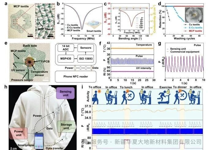 Figure 4 | Electromagnetic performance and mechanical durability of smart textiles based on MCP fibers.