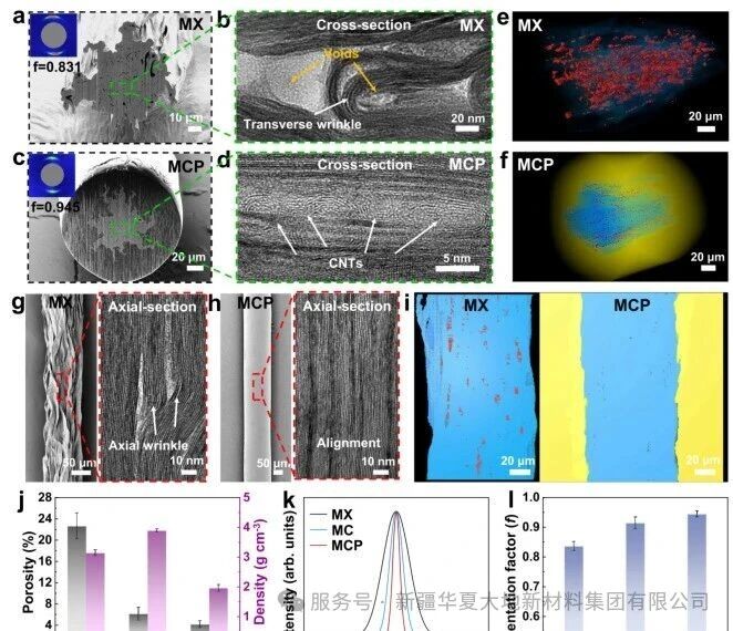 Through Fourier transform infrared spectroscopy and X-ray photoelectron spectroscopy analyses, the researchers confirmed the successful formation of hydrogen bonds between CNTs-MXene and PLA-MXene (see relevant analyses in Figure 2). Three-dimensional reconstructed images from nano-computed tomography clearly show that pure MXene fibers contain a large number of voids (marked in red), whereas MCP fibers exhibit significantly reduced voids and a much denser structure (Figures 2e, f). In addition, high-resolution transmission electron microscopy images of the axial cross-sections demonstrate that after static filling and dynamic stretching, the MXene nanosheets inside the fibers are highly ordered in arrangement, with wrinkles largely eliminated (Figures 2g–i). The study also systematically optimized the length and dosage of CNTs, revealing that the filling effect and performance improvement are most pronounced when the CNT length is ~0.46 μm and the dosage is 3 wt% (Figures 2j–l).