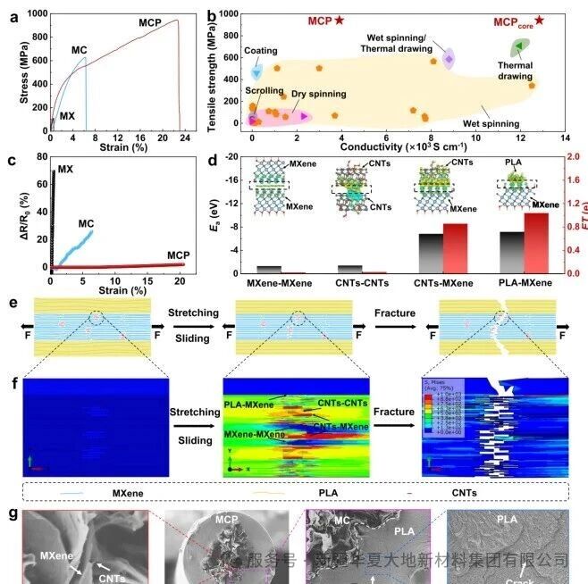 Benefiting from the dense structure and strong interfacial hydrogen bonding interactions, the MCP fibers achieved breakthrough mechanical and electrical properties (Figure 3a). Their tensile strength and toughness reached 9 times and 411 times those of pure MXene fibers, respectively. Compared with all previously reported MXene-based fibers, the MCP fibers take a leading position in terms of both strength and electrical conductivity (Figure 3b). Real-time resistance-strain tests showed that the resistance of MCP fibers changed minimally (~2%) before fracture, indicating that their internal structure remained intact during deformation (Figure 3c). Cyclic loading tests also verified that the MCP fibers retained 85.6% of their electrical conductivity after 4000 cycles, with durability far superior to that of the control samples. Density functional theory (DFT) calculations and finite element simulations revealed the fracture mechanism: during stretching, the MXene-MXene interfaces with relatively weak bonding strength slipped first; subsequently, the stronger hydrogen bonds between CNTs-MXene and PLA-MXene fractured sequentially and dissipated energy; the pull-out of CNTs and the cracking of the PLA coating layer further contributed to the high toughness and high strength of the fibers (Figures 3d–g).