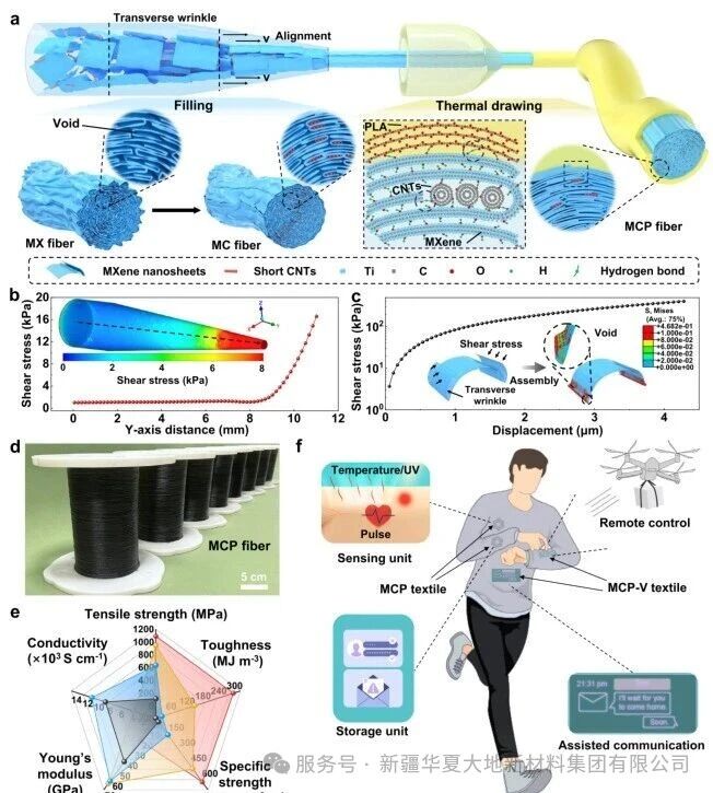 e. Radar chart showing the tensile strength, toughness, specific strength, Young’s modulus, and electrical conductivity of MXene composite fibers (including MX, MC, MCP, and MCP-V).