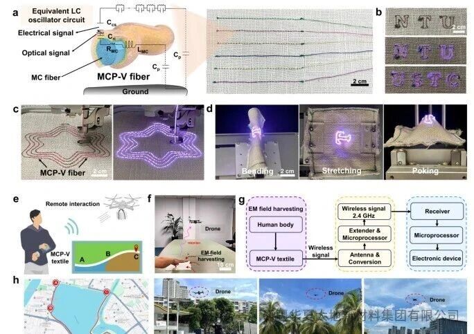 Furthermore, the research team prepared MCP-V fibers with a three-layer structure by coating the outer layer of MCP fibers with vinyl silicone resin/acetate silicone resin and ZnS:Cu²⁺ phosphors (Figure 5a). While maintaining high mechanical properties, these fibers also possess the ability to emit light and generate wireless signals under in-vivo coupled electromagnetic fields, and can operate without batteries. When embroidered into patterns or characters, they can be made into luminescent textiles for auxiliary communication (Figures 5b, c), with stable luminescence even under deformations such as bending and stretching (Figure 5d). More importantly, using such fiber fabrics, wireless signal transmission triggered by human touch can be realized, thereby remotely controlling unmanned aerial vehicles (UAVs) to complete a series of complex operations including take-off, landing, forward movement and load-bearing, with a control distance of up to approximately 5 kilometers (Figures 5e–h).
