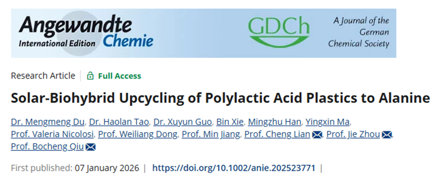 2026年1月7日,降塑再造(MIX-UP)团队中南京工业大学和南京农业大学合作在Angewandte Chemie International Edition发表题为《Solar-Biohybrid Upcycling of Polylactic Acid Plastics to Alanine》的研究成果,南农大邱博诚教授、南工大周杰副教授和华东理工练成教授为共同通讯作者,南工大谢彬博士为论文共同第一作者,MIX-UP团队姜岷教授和董维亮教授为实验设计提供了指导,该工作得到了国家重点研发计划循环经济专项(2024YFC3908300)、江苏省碳达峰碳中和科技创新专项资金(BT2025030)等项目支持。