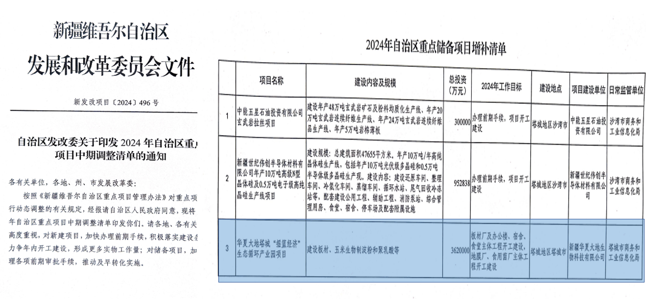 2024年8月,新疆维吾尔自治区发展和改革委员会印发《2024年自治区重点项目中期调整清单》(新发改项目〔2024〕496 号),新疆华夏大地新材料集团有限公司(原新疆华夏大地生物科技有限公司)建设的塔城“摇篮经济”生态循环产业园项目,成功入选自治区重点储备项目增补清单。项目正式纳入自治区重点项目管理体系,在政策支持和要素保障上得到重点倾斜,为项目加快推进建设提供了有力支撑。