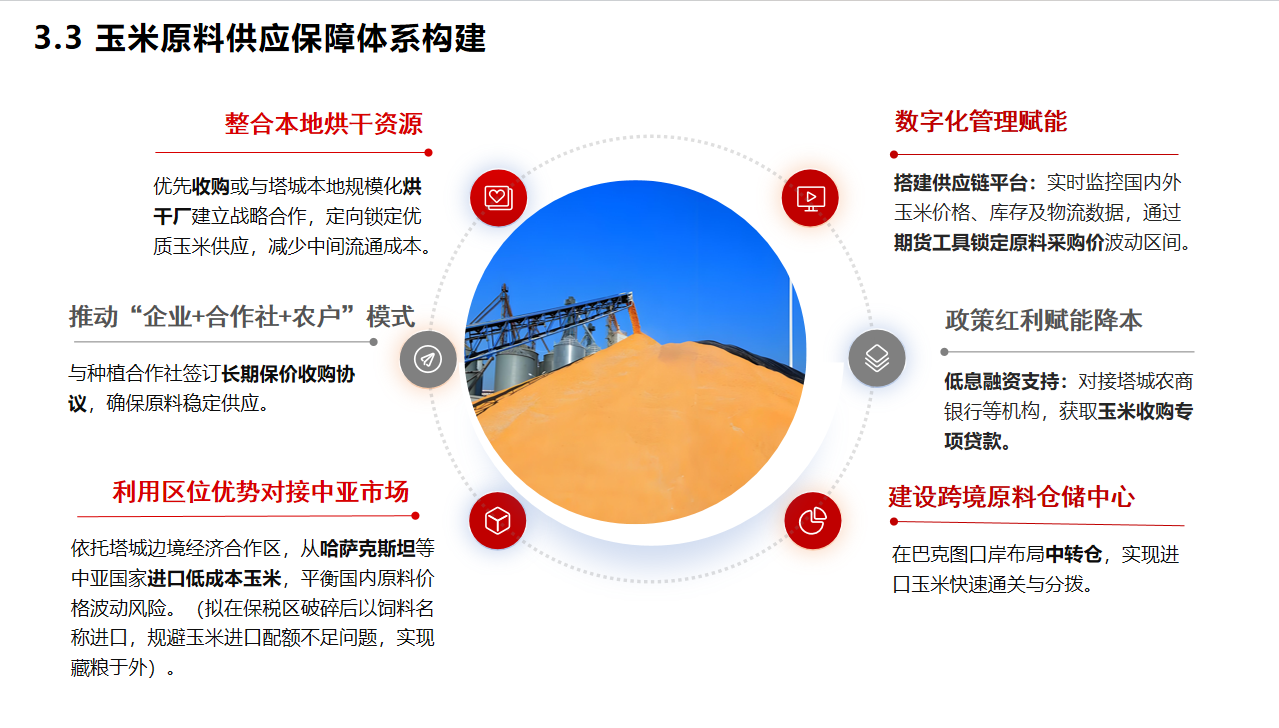 a.优先收购本地达标合格工业专用玉米原料,或与塔城本地具备规模化加工能力、仓储烘干资质齐全、信誉实力雄厚的大型规模化烘干厂建立长期固定深度战略合作关系,实行定向供货、定向加工、定向交付的专属合作模式,定向锁定大批量高品质工业专用玉米资源稳定持续供应,省去多层中间商转手分销环节,大幅减少中间流通周转环节产生的额外费用,切实降低原料采购、运输及流通综合成本,实现原料源头直采、成本最优管控。